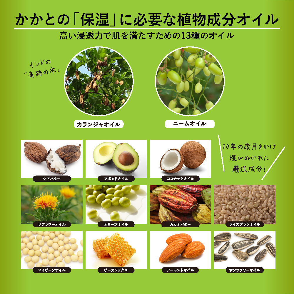 ヤシ油、ミツロウ、ハイブリッドサフラワー油、カルナウバロウ、水添ダイズ油、クロヨナ種子油、ミリスチン酸イソプロピル、メリアアザジラクタ種子油、酢酸トコフェロール、香料※、シア脂、カカオ脂、アーモンド油、アボカド油、コメヌカ油、オリーブ果実油、ヒマワリ種子油、 コーン油、パルミチン酸レチノール、トコフェロール、カプリル酸グリセリル ※天然成分